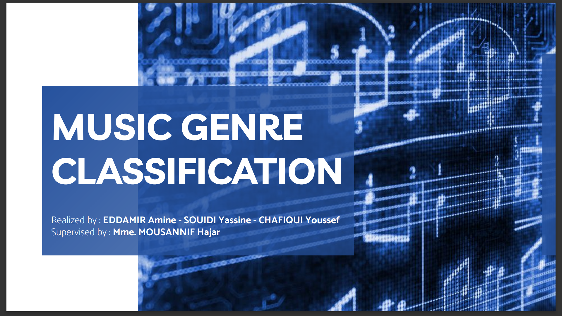 The aim of the project is to avoid having to manually classify music into categories. To automate the process we use Machine Learning and Deep Learning algorithms and this is what we will implement in this project.