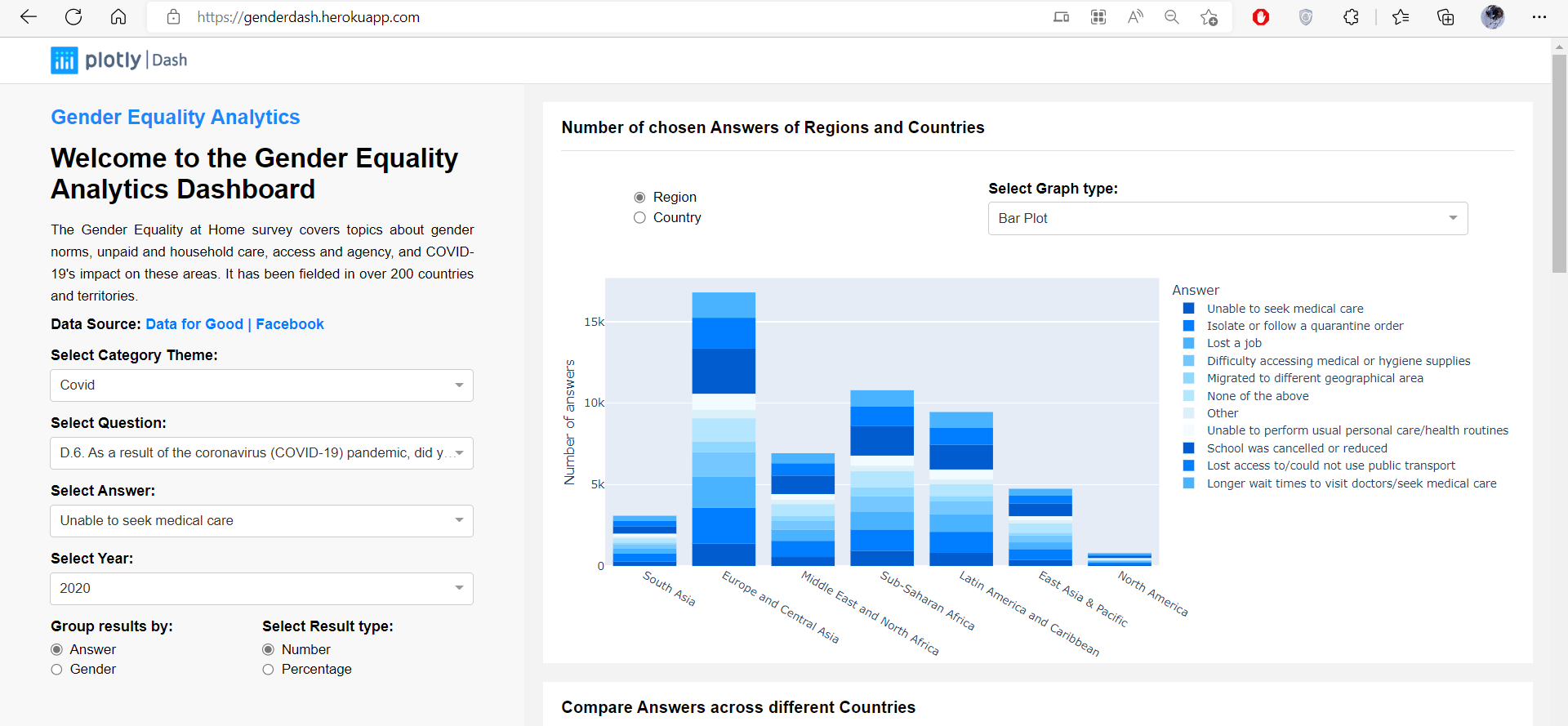 The Gender Equality Analytics Dashboard is a web-based analytic application that represents a graphical overview of the survey results. We also used the Apriori algorithm to detect the modalities that tend to appear together and display the result in the dashboard. The application is written in Python, using Plotly and Dash frameworks. Link to the web application